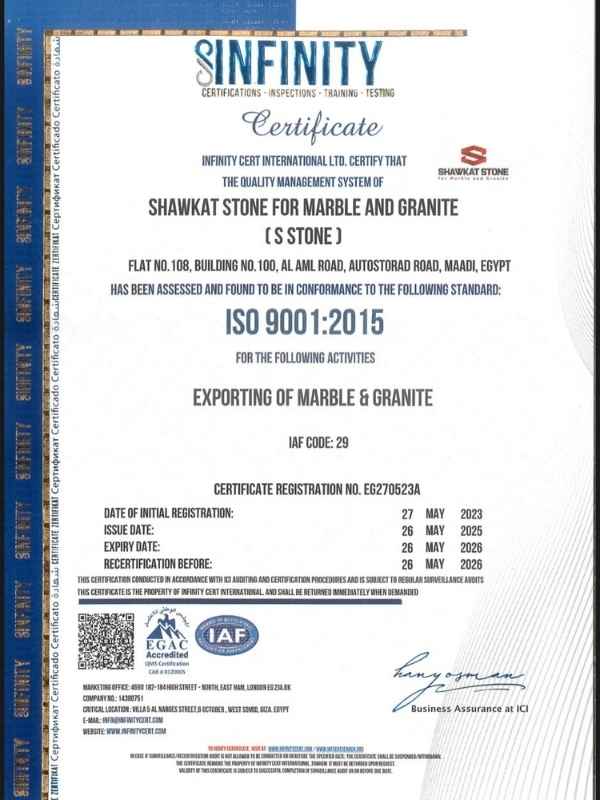 At Shawkat Stone, we are proud to hold the ISO 9001:2015 certification, demonstrating our commitment to delivering high-quality marble and granite products while adhering to the highest international standards of quality management and customer satisfaction.