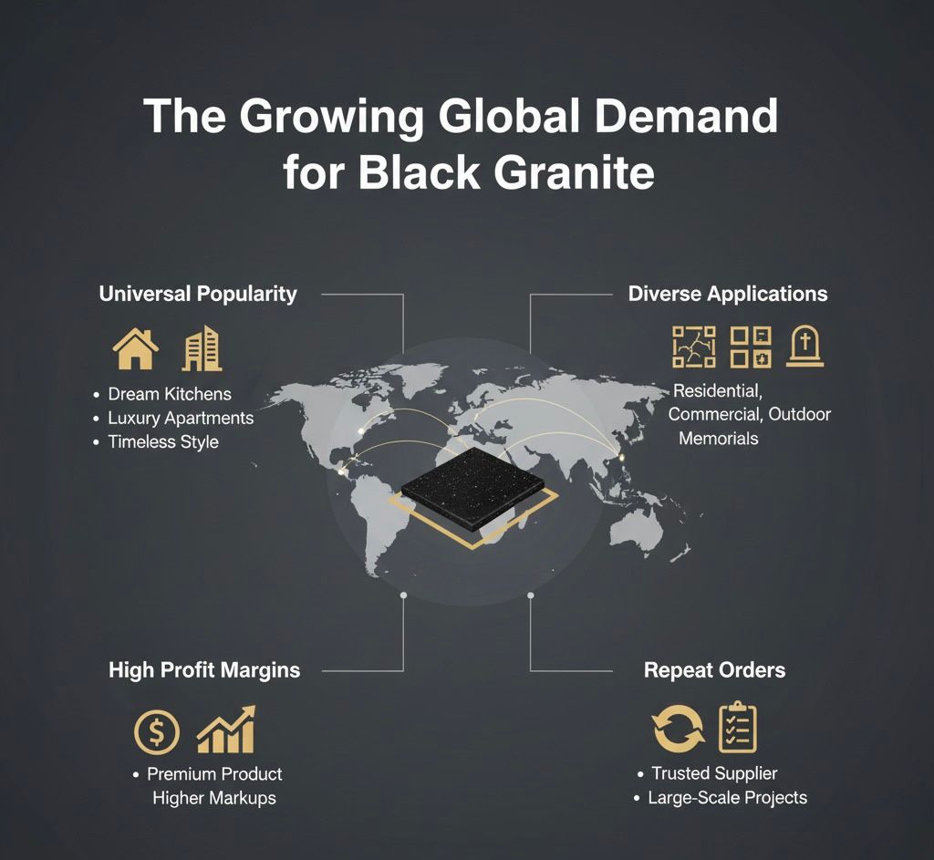 Since black granite is used in large-scale flooring, wall cladding, and façade projects, one contract can easily translate into a full container order or even multiple containers.