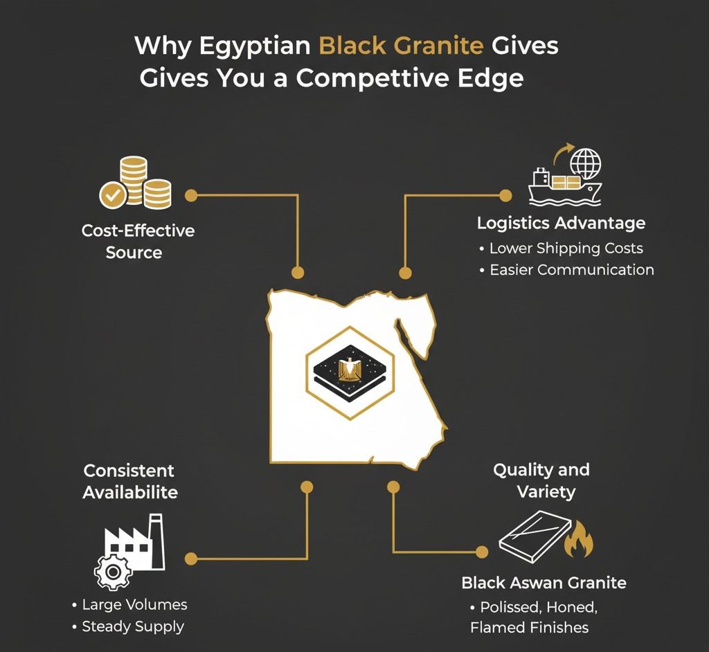 Black natural stone is one of the safest and most profitable products you can import as a building material supplier. The demand is constant, the applications are diverse, and the profit potential is high. Egyptian black granite, in particular, gives you a competitive edge thanks to its affordability, availability, and proximity to key markets.