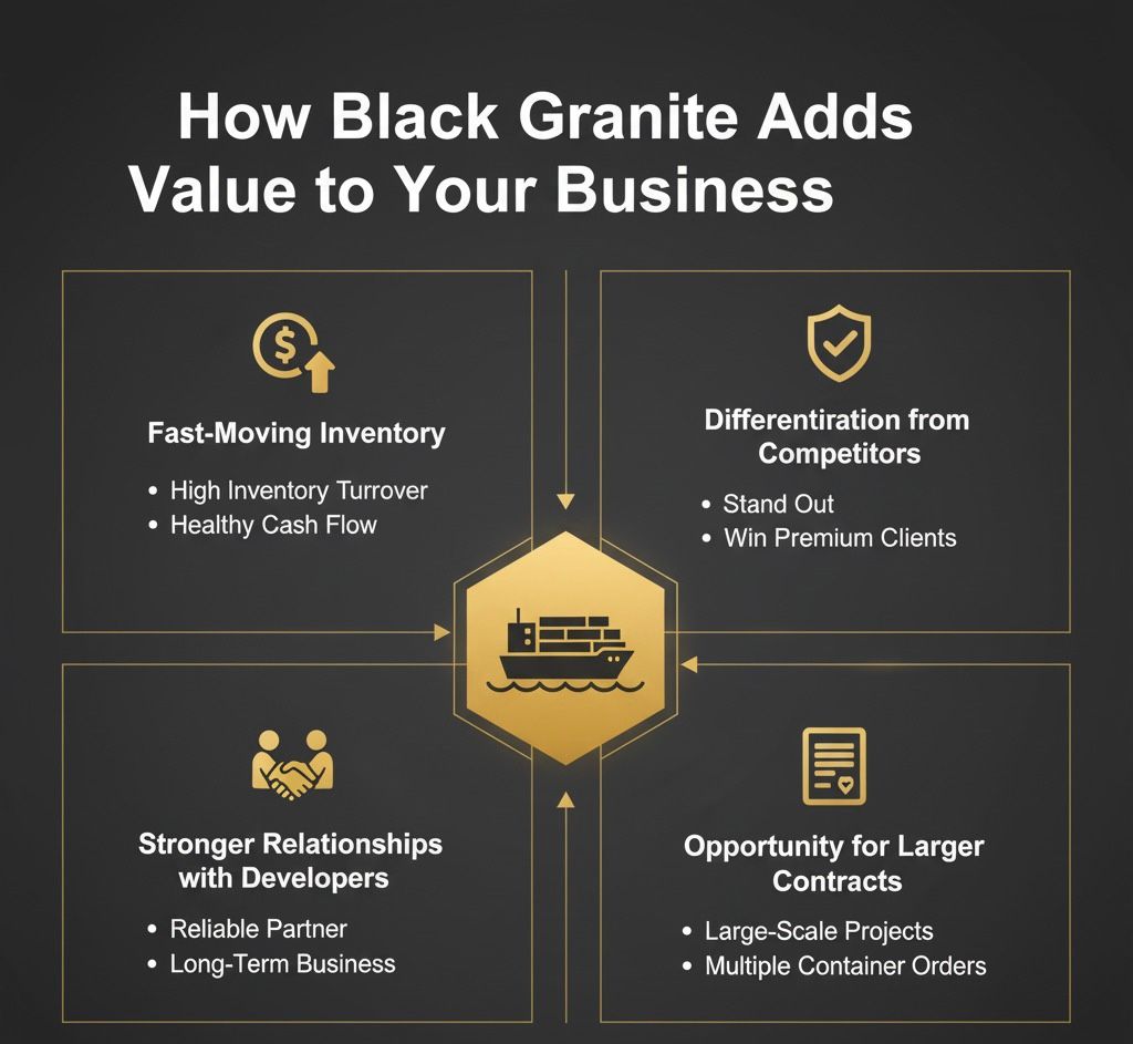 Large-scale contractors and developers often use the same stone across multiple projects for consistency. Once you become their trusted supplier of black granite, you can expect repeat container orders.
