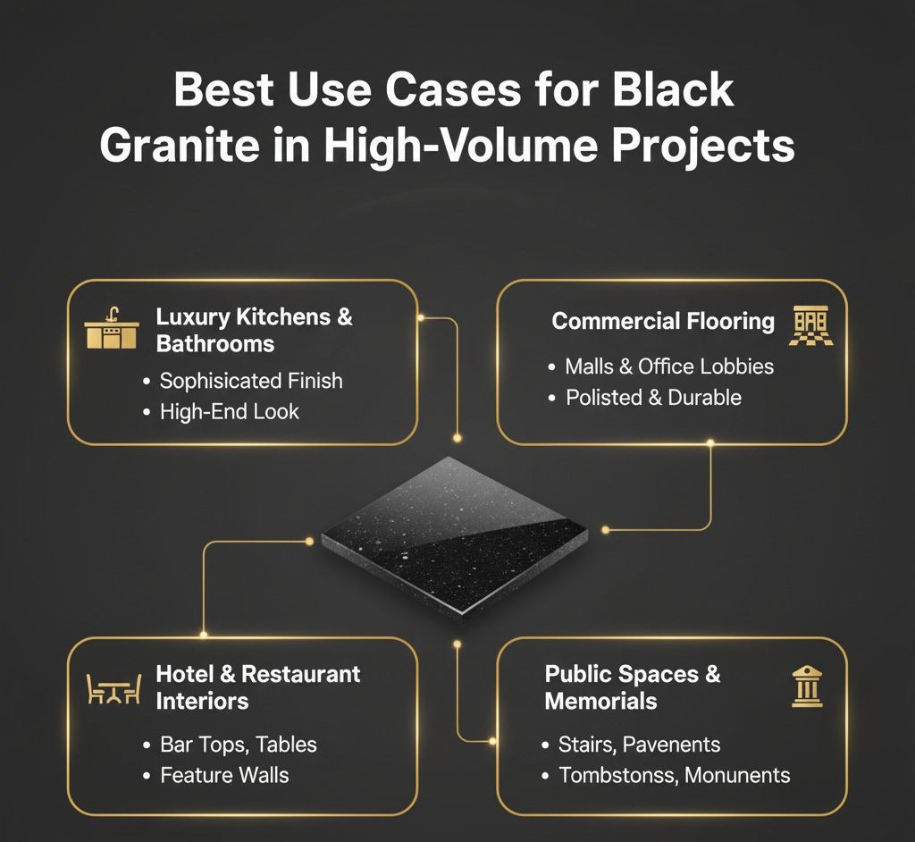 - Commercial Flooring : Polished black granite flooring is common in malls and office lobbies.