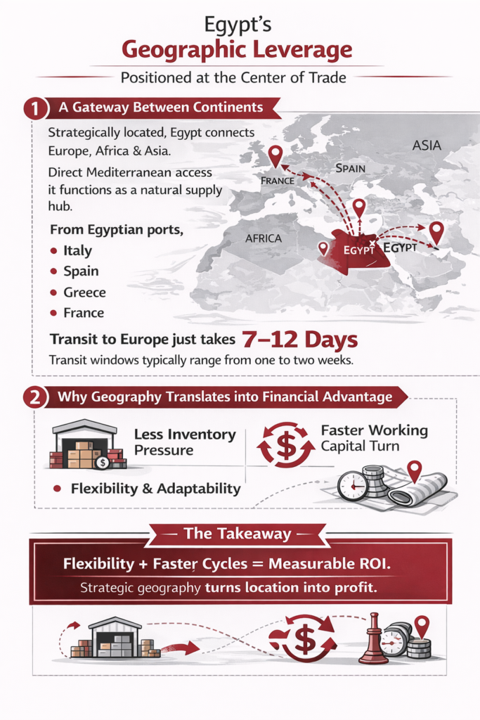 Egypt sits at a strategic crossroads connecting Europe, Africa, and Asia. With direct Mediterranean access, it functions as a natural regional supply hub.