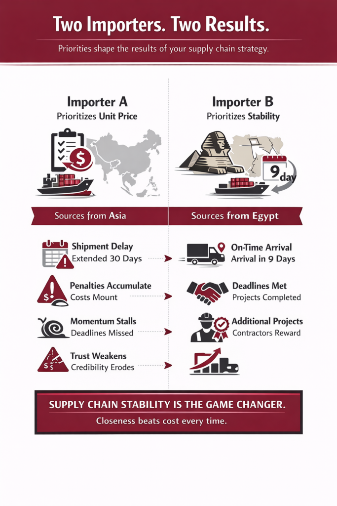 Importer B sources from Egypt. The shipment arrives in nine days. Deadlines are met. Contractors award additional projects.