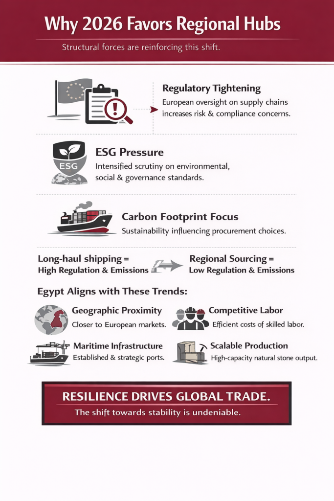 Egypt aligns with these macro trends through geographic proximity, competitive labor economics, established maritime infrastructure, and scalable natural stone production.