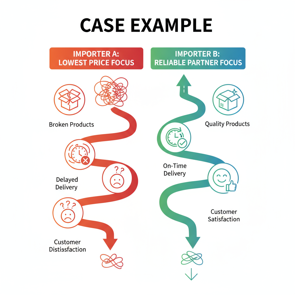 - Importer A chooses suppliers based only on the lowest prices. After a few shipments, quality issues emerge, leading to complaints and financial losses.